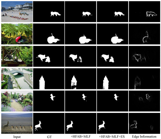 Qualitative results of the edge supervision. From the first to the fifth column, the manipulated image, the ground truth mask (GT), the prediction of our model without the edge supervision (denoted as +HFAB + MLF), the prediction of our model with edge supervision (denoted as +HFAB + MLF + ES),and the output of the edge.