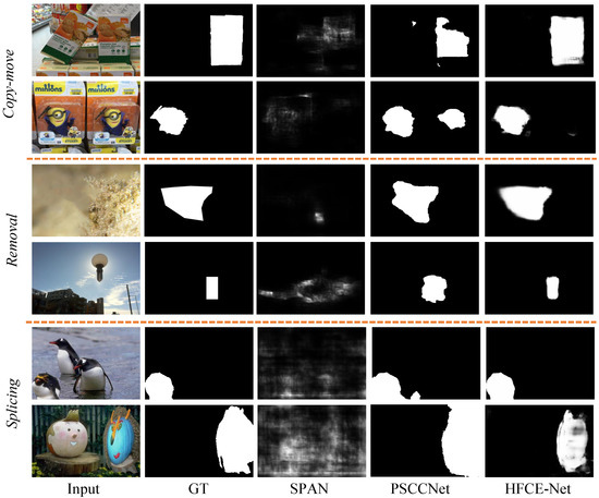 Qualitative results compared with previous methods. From the first to the fifth column, we show the manipulated image, the ground truth mask (GT), the prediction of SPAN, the prediction of PSCCNet, and the prediction of our model.