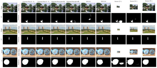Qualitative results of robustness. In this section, we show the qualitative results of the manipulated images under different attacks, including Gaussian Blurring with kernels , Gaussian Noise using different deviations , JPEG Compression with different quality factors , and the Resize image with different factors of 0.22, 0.5, and 0.78. The performance is shown in Figure 9. As shown in Figure 9, our model achieves satisfactory results while the image has been attacked.
