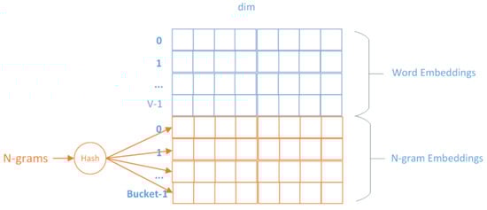 Additionally, the FastText model boosts the categorization capability of the model by training tricks. There are two main ways: the first is to improve operational efficiency by using the hierarchical softmax layer. The hierarchical softmax uses the Huffman tree structure instead of the flat softmax. It mainly uses the Huffman coding method to encode multiple tags, and the values of all leaf nodes are calculated by the original calculation. It needs to calculate only the value from the root node to one of the leaf nodes, which greatly reduces the complexity of model training and the test time on the test set. The second is to apply N-grams to extract features and use the hashing algorithm to map the 2-gram and 3-gram vocabulary information into two tables. Because the vocabulary of 2-grams and 3-grams is much larger than that of word embedding, the hash bucket method is used to map 2-grams and 3-grams to buckets, and the 2-grams and 3-grams in the same bucket share the same word vector. The matrix composed of word embedding and N-grams is depicted in Figure 2.