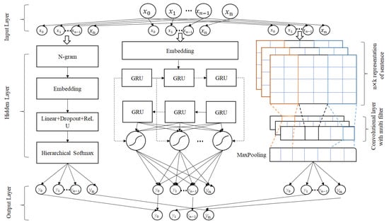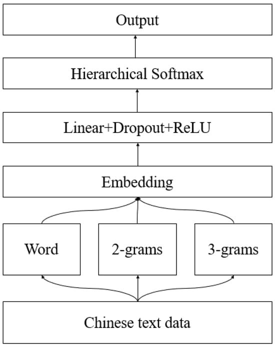 The FastText [] model has the function of word vector computation and classification. To enhance the classification capabilities, the objective model is trained by expanding the layers of the network model, while FastText utilizes a shallow network composed of the input, hidden and output layers. Figure 1 shows its basic structure.