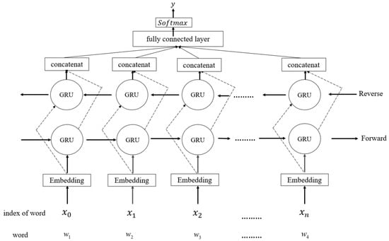 In the bidirectional GRU network, the forward- and backward-learning GRU do not interfere with each other before the model output, and the weight matrix of the input, hidden layers and bias term are also not shared []. At the output, the forward-learning text information and the backward-learning text information are spliced, and the feature vector is output at time t, which is finally normalized using the softmax function and calculated based on Formula (21).