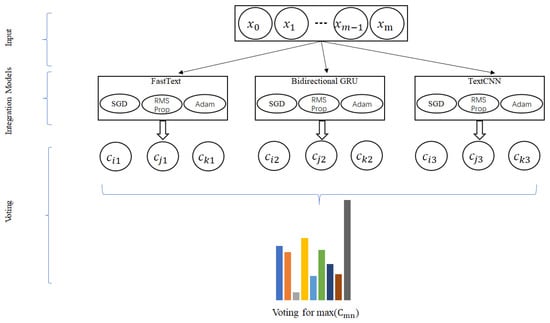 At present, there are two problems to be solved in text classification: one is the accuracy of multilabel category text data, and the other is the network structure of the classifier models []. In general, the deeper the structure of the network is, the better the classification effect is. However, the computational complexity and space complexity of the model increase exponentially. In practical applications, such a deep network model will lead to a very slow classification speed. To balance the accuracy and depth of the model, shallow network models are frequently employed to address the depth of the model, while integrated models are applied to address the accuracy of text classification. For shallow models, single-network structures based on deep neural networks (DNNs) [], recurrent neural networks (RNNs) [] and convolutional neural networks (CNNs) [] are often used. For integrated models, Schapire R E [] proposed the boosting classification algorithm, which creates a single strong learner by combining several weak learners, improving classification performance, followed by the bagging algorithm []. Combinations of models have also emerged in deep learning, and Lai S [] used a combination of the CNN and RNN, also known as the recurrent convolutional neural network (RCNN) model, that is capable of not only extracting important features in text but also obtaining contextual information about the text, which leads to excellent categorization effectiveness in text categorization assignments. Additionally, a random multimodel for text categorization based on three deep learning network architectures was proposed by Kowsari [,]. It utilizes DNN, RNN and CNN architectures to stochastically generate neurons and hidden layers for each model and derives the prediction results with majority voting to enhance the accuracy of text categorization. However, because the quantities of neurons and hidden layers are generated at random, the structure of the generated network is variable with each iteration, resulting in difficult training of the models and very complicated computation []. In addition to the combination of the three network architectures, hierarchical deep learning for text classification was introduced by K. Kowsari []. It integrates all deep learning techniques into one hierarchy for document classification with enhanced accuracy over conventional approaches.