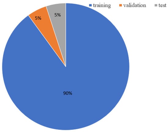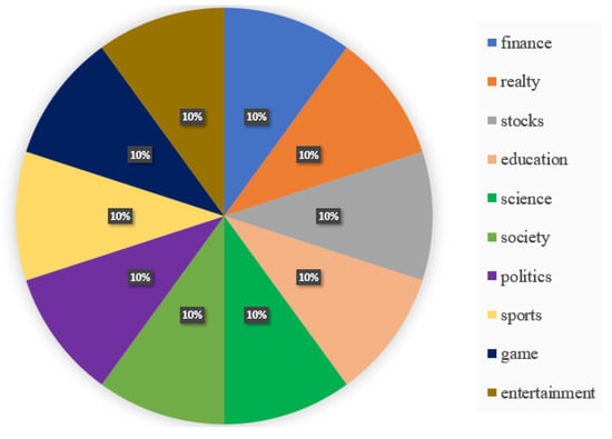 The THUCNews dataset supplied by the NLP group of Tsinghua University is applied in this experiment, and the news headlines in each text datum are extracted as the basis for classification. The length of the text is between 20 and 30, with a total of 10 categories. Each category has 20,000 pieces of text data. For 200,000 pieces of news text data in total, the division of samples in each category is shown in Figure 9. In this experiment, the THUCNews news data are completely separated into three parts, with 90% for model training and 5% each for testing and validation, as shown in Figure 10.