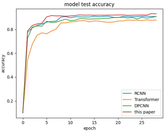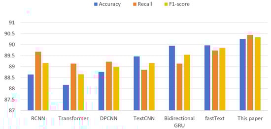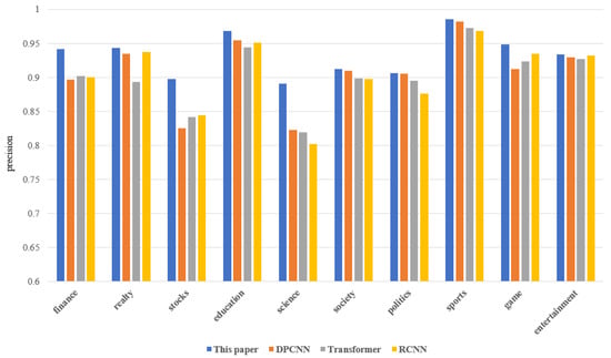 To prove the superiority of this experimental model, the RCNN model, pre-trained transformer model, deep pyramid convolutional neural network (DPCNN) model and integrated model are used for comparative experiments. The transformer model, through the use of residual connections, a self-attention mechanism and positional encoding, can effectively address issues related to temporal and textual sequence positions. Given the superiority of the transformer architecture model in text classification, we compare the transformer model in this paper with our model, observing their performance on a news dataset. Each group of comparative experiments uses the same dataset and corpus. Figure 11 displays the classification results of all comparison models under the verification set. The classification result of the integrated model under ten categories is better than that of any group of comparative experiments.