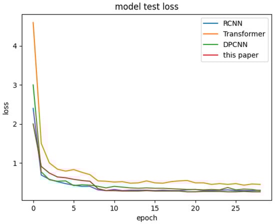 From Table 5, this paper demonstrates that the proposed model implements an excellent classification effect on the THUCNews dataset, reaching 92.57%. The transformer model has the smallest such effect, with an accuracy of 90.14%. Among the other models, the RCNN and DPCNN reach 90.93% and 90.90%, respectively. Regarding recall and F1-score, the model of this paper is higher than the other models, reaching 92.88% and 93.08%, respectively. The result of the final comparison is shown in Figure 13. To further capture the loss variation of the model during the iterative process, the loss changes of different models are shown in Figure 14. Figure 14 illustrates that after using the optimization algorithm, the loss value of the integrated model steadily decreases and ultimately converges to a stable numerical interval, while the loss of the other models is overall larger than that of the integrated model. This result shows the superiority of the optimization algorithm used in this paper.