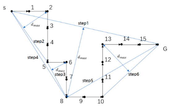 - If , it means that the start and end points S and G cannot fully reflect the characteristics of this path and thus need to be divided further. Split the path at the path point corresponding to into two parts, and repeat step (2) again.