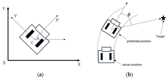 This article selects the Blue Whale Xiaoqiang XQ-5 mobile robot as the experimental platform for experimental verification. This robot is a non-omnidirectional two-wheel differential mobile robot, and its kinematic model is shown in Figure 4a.