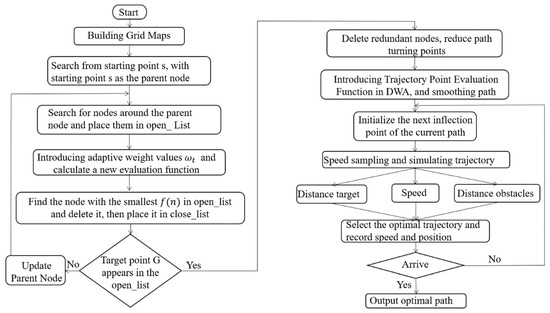 By analyzing the advantages and disadvantages of the algorithms in the literature, it is found that these methods reduce the path length, improve the search efficiency, and reduce the number of turns compared to the traditional A-star algorithm. However, each of these algorithms has its own shortcomings and is only applicable to static maps. In response to this, this article introduces adaptive weights into the heuristic function of the A-star algorithm and integrates it with the improved DWA algorithm, thereby enabling the algorithm to have a good path search efficiency and dynamic obstacle avoidance capability. The flowchart of the algorithm improvement in this article is shown in Figure 1.