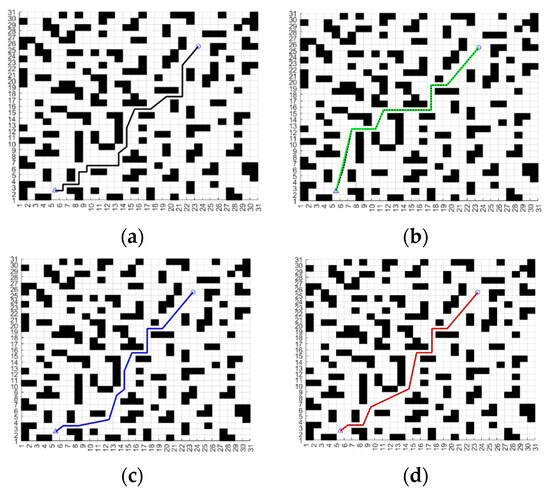 Comparison of algorithm simulation paths: (a) traditional A-star algorithm; (b) Reference [22] algorithm; (c) Reference [23] algorithm; (d) adaptive A-star algorithm.