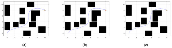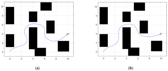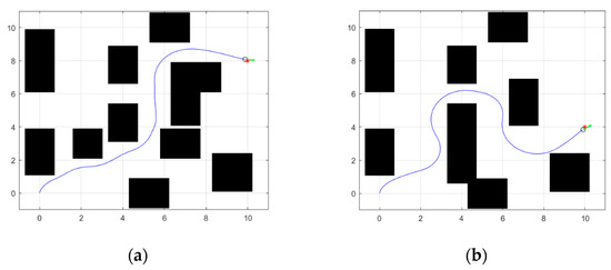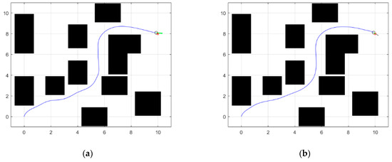From the analysis of the experimental results in Figure 9, it can be seen that when = 0.3 and is certain, the path planning time decreases as increases from 0.05 to 0.15, and the path planning time is very close when is between 0.15 and 0.30. When is certain, the path planning time decreases as increases from 0.02 to 0.06 and increases as increases from 0.06 to 0.10.