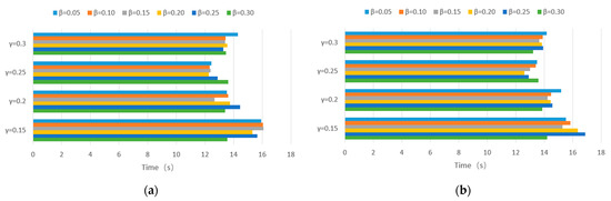 Based on the conclusions drawn from the analysis of and parameters, that is, when = 0.06 and is in the range of 0.15 to 0.3, we analyze the impact of changes in (ranging from 0.05 to 0.3) on the path planning time of the DWA algorithm. The experimental maps still use the two sets of maps in Figure 9, and the experimental results are shown in Figure 10.