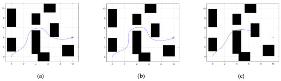 From the analysis of Figure 11 and Figure 12 and Table 2, it can be seen that under two different sets of maps, when = 2, the robot’s travel time is the shortest, and no collisions occurred, ultimately finding the destination. To further verify the effectiveness of the newly added trajectory point evaluation function in the original DWA evaluation function, experiments were conducted before and after the addition of the trajectory point evaluation function when = 0.06, = 0.20, and = 0.25. The results are shown in Figure 13 and Figure 14.