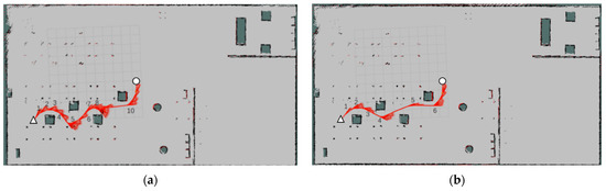 Navigation Effect of traditional A-star algorithm and adaptive A-star algorithm: (a) traditional A-star algorithm navigation experiment; (b) adaptive A-star algorithm navigation experiment.