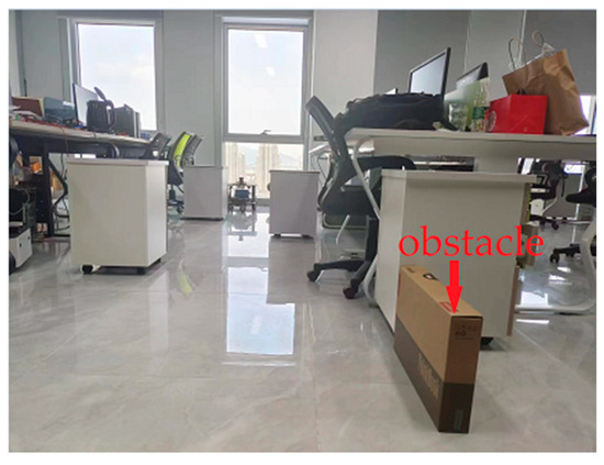 Based on the above experiments, while ensuring that the starting point and target point remain unchanged, add an unknown obstacle on the planned path, as shown in Figure 19. Additionally, establish a Gazebo simulation environment in the ROS system to simulate the experimental site map settings as closely as possible and verify the feasibility of the simulation and actual experiment in real time. Start the fusion algorithm, and the results are shown in Figure 20.