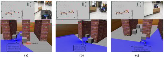 Fusion algorithm navigation effect: (a) robot lidar scans unknown obstacle; (b) robot is avoiding unknown obstacle; (c) robot completes obstacle avoidance and reaches the target point.
