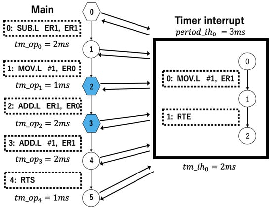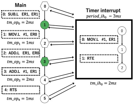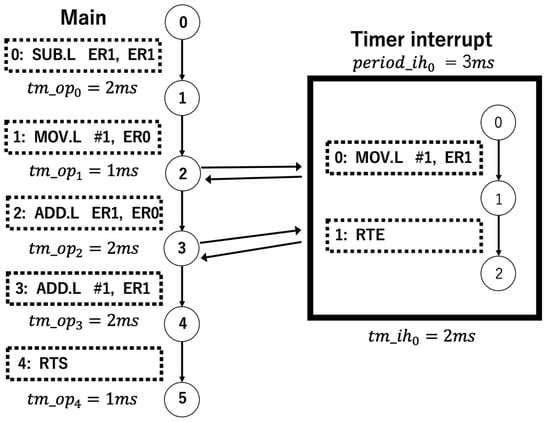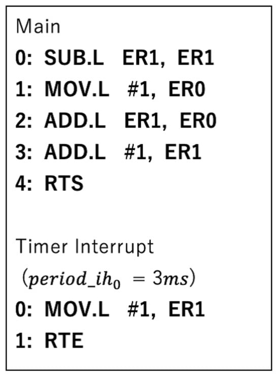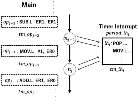 - Step 2.The execution time is calculated and the label is determined. First, in order to calculate the execution time, the outermost loop denoted by “FOR of ” adds up the execution times of the instructions. Next, the inner loop denoted by “FOR interrupts” depends on whether timer interrupts or normal interrupts are used as follows: