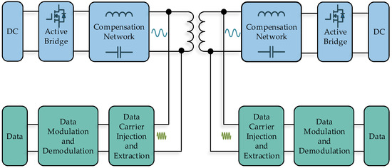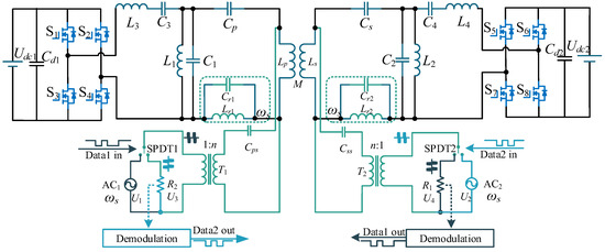 Bidirectional data transfer is achieved through frequency division multiplexing coupling coils, using parallel connection to inject and extract the data carrier and adding an LC parallel network to achieve impedance isolation between the power carrier and data carrier [21]. The injection and extraction method of the BD-SWPDT data carrier is shown in Figure 10.