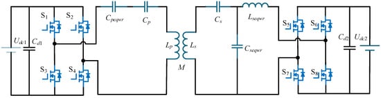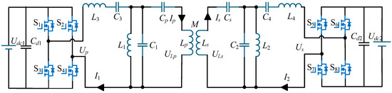 When power and data are transferred simultaneously via the same pair of coupled coils, the data transfer channel will be greatly interfered with by the harmonics components of the power transfer channel. To suppress the interference of the power transfer channel, compensation topologies with band-pass filtering characteristics such as LCC compensation topology are usually adopted in both sides of an SWPDT system [19]. A bidirectional constant voltage LC hybrid compensation topology is proposed in the paper, as shown in Figure 2. Based on the capacitive or inductive characteristics of LC series in parallel networks at different frequencies, the system topology is equivalent to different constant-voltage output topologies in the forward and reverse transmission processes, controlling the frequency during the bidirectional transmission of electrical power, and achieving constant-voltage output in the bidirectional transmission process. Udc1 and Udc2 are equivalent DC power sources for forward and reverse power transfer. Lp and Ls are the self-inductance of the primary and secondary coils, M is the mutual inductance of the coupled coils, Ip and Is are the current of the primary and secondary side coils, ULp and ULs are the voltages of the primary and secondary side coils, Up and I1 are the voltage and current of the primary side inverter, Us and I2 are the voltage and current of the secondary side inverter, and Cd1 and Cd2 are the input or output filtering capacitors. S1–S4 and S5–S8 represent the active bridges composed of four MOSFETs on the primary and secondary sides, respectively, and they are used to achieve DC inversion and controllable rectification in the bidirectional power transfer. LC hybrid compensation topologies are adopted on the primary and secondary sides of the system.