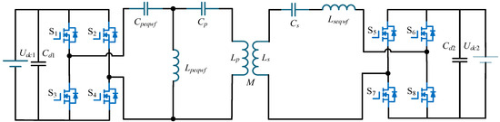 When power is transferred in the forward direction, the secondary side active bridge operates in rectification mode, and the inverter can be treated as a voltage source Up and the load, while the rectifier is equivalent to a resistor Rseq. Based on First Harmonic Approximation (FHA), . The further equivalent circuit of the forward power transfer channel is shown in Figure 4.