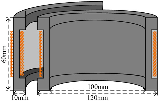 The dimension of the proposed caliper-type coupler is depicted in Figure 7. The inner and outer diameters of the coupler are 100 mm and 160 mm, respectively, the air gap between the inner and outer ring is 10 mm, and the height of the coupler is 60 mm. With the parameters listed in Table 1, the magnetic flux density map of the coupler obtained by applying a 5 A current excitation current to the primary and secondary sides of the coupler using magnetic field simulation software is shown in Figure 8.