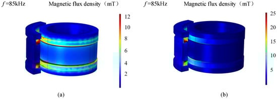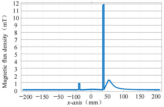 When the excitation current increases, the magnetic flux density of the coupler increases. To avoid magnetic saturation, the analysis of the magnetic flux density in the x-axis direction of the system is shown in Figure 9. The maximum magnetic flux density of the system is 12 mT, which is lower than the magnetic saturation threshold of the magnetic core, and the system can work normally.
