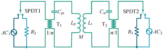 In the data transfer circuit, AC1 and AC2 are the data carrier voltage sources of the primary and secondary sides, respectively. The ASK modulation and loading of the data carrier are achieved by controlling the on–off of the analog switches SPDT1 and SPDT2. Transformers T1 and T2 are used to achieve electrical isolation between the data transfer circuit and the power transfer circuit. R1 is the sampling resistor of the secondary side during forward data transfer, R2 is the sampling resistor of the primary side during reverse data transfer, and the voltages of R1 and R2 are sampled for data demodulation. Cps and Css are series compensation capacitors for the primary and secondary sides of the data transfer channel, and their values satisfy