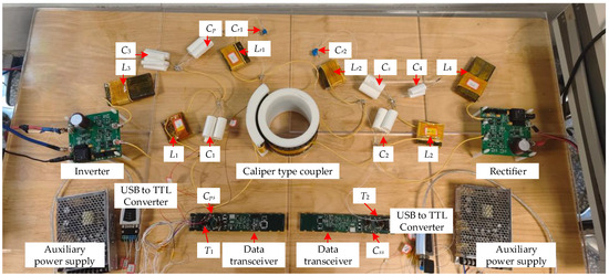With the parameters listed in Table 2, an experimental prototype shown in Figure 12, built based on Figure 2 to verify the feasibility of the proposed BD-SWPDT system. The two auxiliary power supplies are used to power the data transceivers. Two USB to TTL converters are utilized to transmit and receive the data through the computer. A DC power supply (ITECH-IT6522C) is used as the DC power source and an electronic load (ITECH-IT8813) is used as the load. In the data transceiver, a direct digital synthesizer (DDS, AD9833) is used to generate the high-frequency data carrier, an analog switch (ADG5419) is used to modulate the data carrier, and an operation amplifier (BUF634) is used as the high-speed buffer to drive the coils.