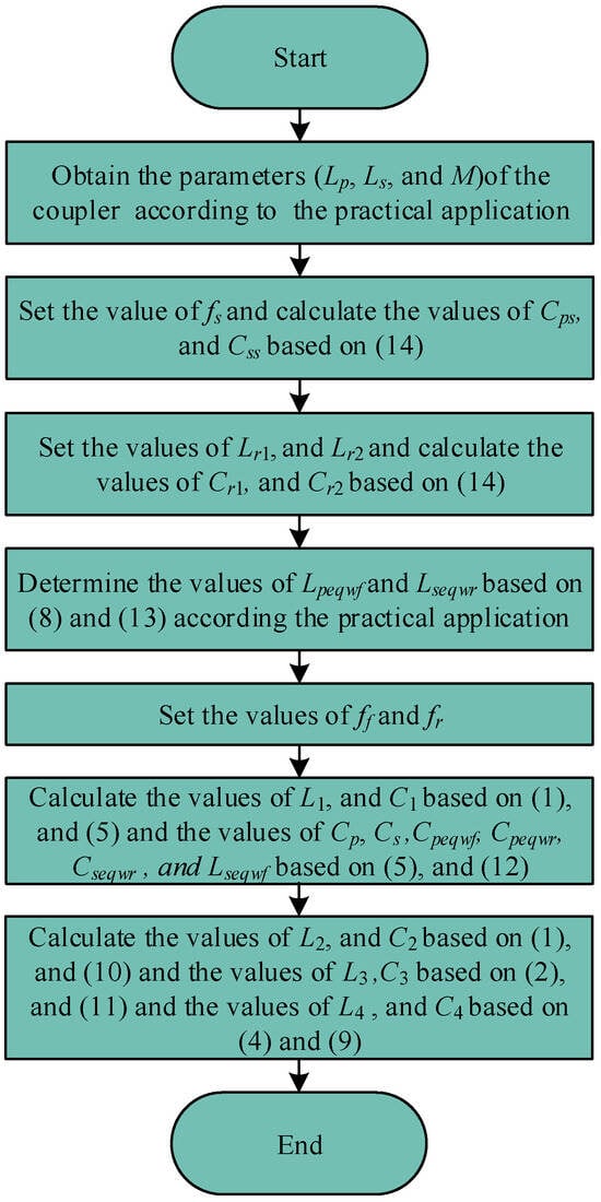 The procedures for the parameter design of the proposed system are depicted in detail in the flow chart shown in Figure 13. The values of Lpeqwf and Lseqwr can be determined according to the mutual inductance and the transfer gain requirement of the practical application, and other parameters can be calculated from the equations listed.