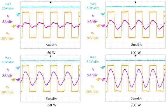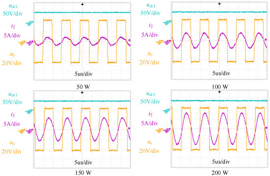 When power is transferred in the forward and reverse directions, the waveforms of the power transfer channel under different output powers are shown in Figure 14 and Figure 15, respectively. It can be seen from Figure 14 and Figure 15 that the voltage of the inverter is slightly ahead of the inverter current, achieving zero voltage switch, the output voltage almost remains constant under different output powers, and the voltage transfer gain of the forward power transfer is the same with the reverse power transfer. The electronic load is set to constant power mode, and when the output power is 200 W, the efficiencies of the forward and reverse power transfer channel are 88.1% and 88.8%, respectively.