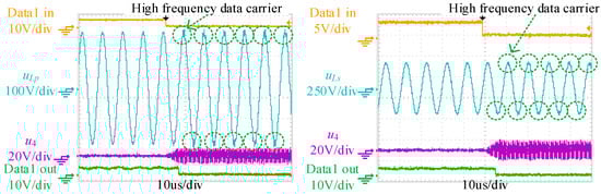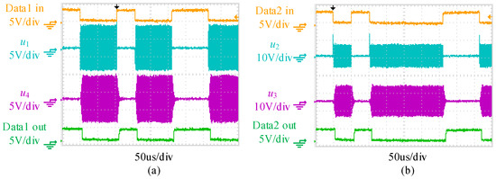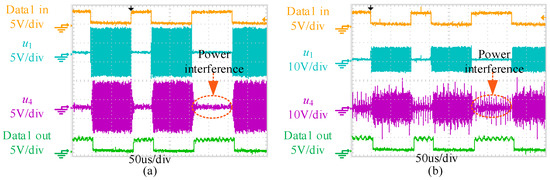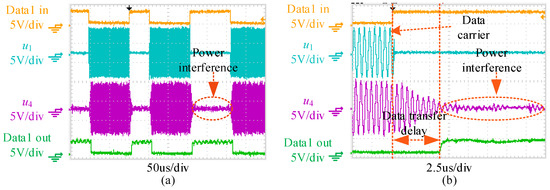 To verify the effect of the proposed power transfer topology on the suppression of power interference, and due to the open circuit characteristics of the parallel networks (L2, C2) and (L1, C1) when power are transferred in the forward direction and the reverse direction, respectively, the waveforms of the data transfer channel are measured and shown in Figure 19. Here, power and data are transferred simultaneously with the LC parallel networks removed. Comparing Figure 19a,b, it can be inferred that the power interference can be significantly suppressed by the proposed topology, resulting in a high-quality transfer of data and reducing the complexity of the data demodulation circuit.