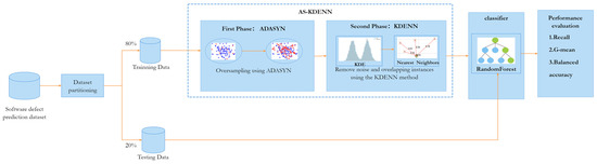 The AS-KDENN method we propose combines oversampling, class overlap, and noise handling. It not only uses oversampling techniques to address class imbalance but also employs the KDENN method based on kernel density (KDE) and distances to manage noise and class overlap data. This approach can mitigate the impact of noise and class overlap induced by oversampling on classification models, thereby enhancing the overall performance of software defect prediction models.
