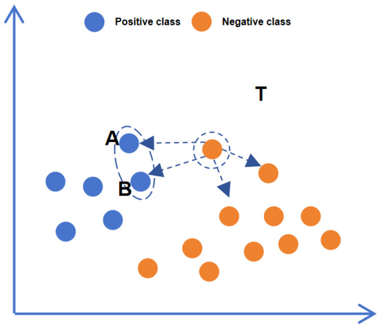 Through the studies in Section 2.2, we found that many class overlap and noise detection methods are based on distance, without considering the local density of instances. Relying solely on distance might lead to certain misjudgments. For example, when using Edited Nearest Neighbors (ENN) to remove overlapping instances, consider a negative sample T as shown in Figure 7. If we are following the nearest neighbor method (assuming K = 5), and the five nearest neighbors of point T mostly contain negative samples, we might deem points A and B as overlapping instances for T and consequently remove these two positive samples as noise. This is clearly unreasonable since A and B, from a spatial perspective, belong to the normal minority class of samples. The same issue can occur when removing negative samples under similar circumstances. This highlights the importance of considering the local density and distribution of samples rather than just their proximity, which can prevent the erroneous removal of valid minority class samples that might appear to be noise or overlapping purely based on distance.