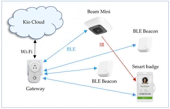 From an infrastructure perspective, the system relies on fixed-position devices: (1) Anchor Beacons, installed in museum rooms and corridors, which provide location reference points; (2) Beam Mini BLE devices, used for room-level localization, which emit the room’s ID via an infrared (IR) transmitter; (3) Portal Light BLE-to-Wi-Fi gateways. These gateways aggregate data from the BLE devices and transmit them to the Kio Cloud for processing and analysis.