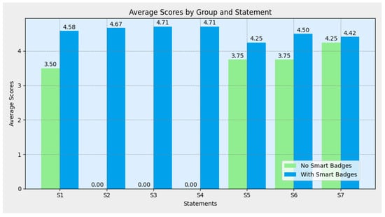 The variation in scores for Statement 1 (S1), which assesses the timeliness of content delivery, can be attributed to the different technologies used for content triggering. Visitors without smart badges relied on GPS geofencing, which updates location data every 10 s in the mobile app’s background mode. This relatively slow update interval can cause delays, resulting in content being delivered after visitors have reached the exhibit. These delays disrupt the intended flow of the experience and likely contributed to lower satisfaction scores, as visitors perceived the content delivery as untimely. In contrast, visitors with smart badges received content through infrared (IR) emitters, which update location data every 1.5 s. This faster update rate allows for nearly instantaneous content delivery as visitors approach an exhibit, ensuring that information is provided precisely when needed. The greater accuracy and immediacy of content delivery for badge users likely resulted in higher satisfaction scores, as the system more effectively met their expectations for prompt and relevant information.