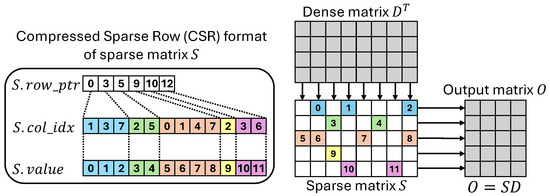 Illustration of SpMM using the compressed sparse row (CSR) format. The sparse matrix S is represented in CSR format, where the number of rows (M) is set to 5, and the number of columns (K) is set to 8. The number of columns (N) on dense matrix D is set to 4; thus, the size of the resulting output matrix O is = 5 × 4.