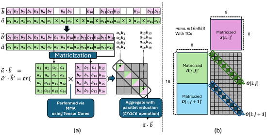 The left side of this figure (a) illustrates fundamental concept of our approach, the transformation of vector–vector dot product into matrix–matrix multiplication via matricization. The right side of this figure (b) describes the transformation using the practical MMA instruction, the MMA.