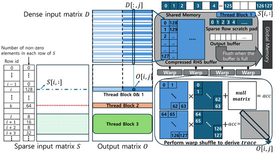 Matrix–matrix multiplication is a key computation in the training of deep neural networks (DNNs), including convolutional neural networks (CNNs), graph neural networks (GNNs), and transformers. In practice, matrix–matrix multiplication involving weights and neuron values dominates over all computations in the training of DNNs [1,2]. Therefore, NVIDIA’s Tensor Cores (TCs) have recently emerged to accelerate General Matrix–Matrix Multiplication (GEMM), also known as dense matrix–dense matrix multiplication, by increasing throughput and reducing memory footprint through the use of lower-precision floating-point formats [3,4,5]. Moreover, with the increasing size of DNNs, various pruning and sparsification techniques have been widely adopted to reduce the number of parameters and computational operations in DNNs [6,7]. Therefore, sparse matrix–dense matrix multiplication (SpMM) has become an essential computational kernel, occupying a substantial portion of the operations in sparse DNNs [8]. Furthermore, training GNNs typically requires performing numerous SpMM operations to multiply a large sparse matrix, derived from the adjacency matrix, with the feature vectors of nodes to aggregate neighbor information within the graph [9,10]. However, unlike GEMM, which can straightforwardly use tiling or blocking techniques to achieve high performance, SpMM is inherently performance-limited on GPUs. As the number of non-zero elements on the left-hand-side (LHS) sparse matrix varies irregularly across rows, achieving good load balance for SpMM on GPUs is challenging. Furthermore, as the non-zero elements are irregularly scattered, irregular memory access leads to poor performance due to reduced cache hit rates on GPUs.