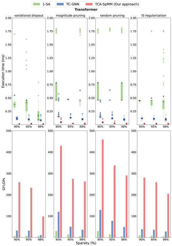 Figure 5 shows a performance comparison of various SpMM parallel implementations optimized with TCs. The top and bottom graphs in Figure 5 show the execution time and achieved peak performance (GFLOPs) of the SpMM implementations, respectively. Note that for a fair evaluation, only the actual execution time of sparse matrix–matrix multiplication was measured for both 1-SA and TC-GNN, excluding the time required for reordering and compression. All experimental results presented in this section are the average of 10 distinct executions. Furthermore, the GFLOPs for each compared implementation were measured using , where is the average number of non-zero elements in the sparse matrices with the same sparsity. The black solid line within each box at the top of Figure 5 represents the median runtime, while the ⋆ symbols indicate the average runtime of different implementations across matrices with varying sparsity. The 698 sparse matrices we used in our evaluation are categorized based on four different pruning techniques applied to the transformer model. In our TCA-SpMM implementation, each thread block is configured with 256 threads, resulting in 8 warps per thread block. Compared to 1-SA and TC-GNN, our TCA-SpMM achieved an average speedup of 29.58× and 6.58×, respectively, across all sparse matrices with sparsity ranging from 90% to 98%. For example, for the sparse matrices pruned with the variational dropout technique, TCA-SpMM achieved a 25.43× and 8.11× average speedup compared to that of 1-SA and TC-GNN, respectively. Furthermore, as the sparsity of the matrices increases, our TCA-SpMM achieved higher speedup over 1-SA and TC-GNN. For instance, with sparsity ranging from 90% to 98%, TCA-SpMM is 13.75×, 19.46×, and 40.81× faster than 1-SA, and 4.07×, 5.47×, and 7.85× faster than TC-GNN on sparse matrices pruned using the magnitude technique. This result implies that the computational complexity of TCA-SpMM is associated with the number of non-zero elements and the operations required for SpMM. It can be observed that our TCA-SpMM shows a greater degree of performance improvement compared to other implementations as the sparsity of the matrices increases. As the sparsity increases, it is evident that the number of floating-point operations decreases. Consequently, the GFLOPs of all compared implementations decrease as the number of non-zero elements decreases across all experiments. However, the GFLOPs of our TCA-SpMM consistently outperformed those of other implementations as shown at the bottom of Figure 5. As 1-SA operates TCs on non-zero blocks in the reordered matrix and TC-GNN operates TCs on dense blocks after the compressing the matrix, both approaches are unable to completely ignore the zero elements within the non-zero blocks. Moreover, as the 1-SA implementation executes cuBLAS serially for both dense and sparse tiles in the reordered matrix, this approach hinders achieving a high degree of parallelism on TCs. However, since our TCA-SpMM processes only non-zero elements using TCs, the number of operations greatly decreases with highly sparse matrices. As a result, the performance of our TCA-SpMM improves more significantly with increasing sparsity than other SpMM implementations.