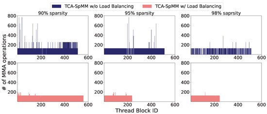 To demonstrate the effectiveness of our load balancing scheme, we compare the number of MMA operations executed across different CUDA thread blocks, with and without load balancing in our TCA-SpMM implementation. Figure 6 shows the distribution of MMA operations across different thread blocks for two versions of the TCA-SpMM implementation: one that considers load balancing (bottom) and another that does not (top). The x-axis indicates the indices of different CUDA thread blocks, and the y-axis indicates the number of MMA operations computed in each thread block. Note that we assigned a single thread block to compute each output row in order to evaluate the performance of our TCA-SpMM implementation without applying the load balancing scheme. Since we used sparse matrices of size 512 × 512 for this experiment, a sparse matrix with 90% sparsity can be assumed to contain an average of 512 × 0.1 = 51.2 non-zero elements per row. However, depending on the matrix’s sparsity pattern, the number of non-zero elements in a row may either exceed or be less than 64, which is the number of elements required for a single MMA operation. Therefore, a matrix with 90% sparsity can lead to a workload imbalance across thread blocks, as each thread block processes a different row of the matrix. As an example, the results from the upper-left graph with 90% sparsity show several outliers in certain thread blocks that process a significantly larger number of MMA operations compared to others. These outliers occur when certain rows have noticeably more non-zero elements compared to others, leading to a significantly higher peak number of MMA operations compared to the majority of thread blocks. Since GPU kernels require all thread blocks to complete before proceeding to the next, the overall performance of the GPUs depends on the completion time of the thread block with the highest workload. As described in Section 4.2.2, we addressed the load imbalance issue caused by exceptionally high workloads by launching additional CUDA thread blocks for rows with a larger number of non-zero elements.