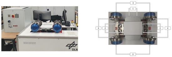 In response to these challenges, the German Aerospace Center (DLR) initiated the internal project “Next Generation Train (NGT)” [], which explores running gears utilizing independently rotating and driven wheels. In this context, a 1:5 prototype of such a running gear was developed, building on previous research [,,,]. Roller rigs are widely used in railway vehicle research for their high controllability, repeatability, and flexibility in experiment setups, as well as their lower cost compared to field tests []. They are particularly valuable when evaluating the stability properties of independently rotating driven wheels (IRDWs) [,,,]. The roller rig discussed in this paper is distinctive, featuring motorized actuation for each wheel and incorporating two separate wheel carriers with different stability characteristics, unlike conventional designs that typically employ only one. The main challenges in controlling IRDWs are twofold.