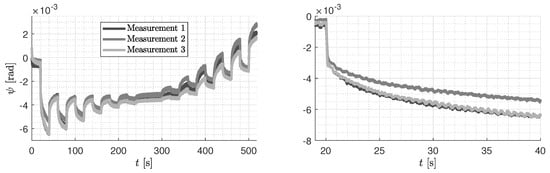 To provide an initial insight into the system dynamics, a step input current applied solely to the rear wheels, with the front wheel carrier not in contact with the rollers, is illustrated in Figure 3. This setup yields the yaw angle measurements depicted in Figure 4. The experiment was conducted three times, revealing qualitatively consistent behavior across all trials but with quantitative differences of up to relative to a total change of . Surprisingly, the measurement signals indicate an open-loop stable system, contrary to expectations from models such as those in [], in which integrating behavior from yaw angle to lateral displacement is suggested. Moreover, the measurements exhibit unexpected steady-state behavior, where the stationary value for differs before and after . Additionally, the step response shown in Figure 4 demonstrates varying dynamics over time. At approximately , a significant yaw angle jump occurs, indicative of a system with very small damping. However, beyond , the convergence to a steady-state value is slow, characteristic of a system with high damping. These observed effects, along with their modeling and parameter identification, are thoroughly discussed in the subsequent sections of this paper.