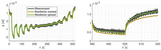 As the input function is not necessarily differentiable, the derivative of the input is obtained from the low-pass filtered input signal with an edge frequency of 10 Hz. With these adjustments, optimization (1) is carried out with the variable damping (7) with , as the results of the previous optimization results and as the only tuning variable and , . The parameter can be found in Table 3 and the simulation result in Figure 8. It can be seen that the response aligns closely with the piecewise damping response and therefore also with the measurements.