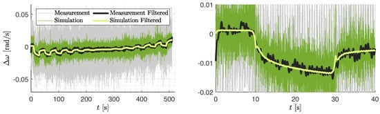 In order to identify the parameters in Equation (4), the angular velocity measurements for one of the open-loop measurements introduced in Section 3 are used and displayed in Figure 6. It can be seen that the raw measurements admit a very bad ratio from unmodeled dynamics to actual modeled dynamics defined by the lateral displacement, yaw angle, and input. However, by introducing a simple forward–backward low-pass filter with edge frequency of , it is possible to reduce the effect of the unmodeled dynamics. For parameter identification, the raw measurements are used, and the right hand-side of (4) is augmented by offset . Optimization problem (1) for , is solved where is obtained by (4) and using the measurements for the right hand-side variables, i.e., and . The optimization results can be found in Table 1, and the simulated signal and its filtered version are displayed in Figure 6. It can be seen that the simulation results closely match the measured values. Among the identified parameters, the equivalent conicity angle is particularly crucial as it significantly impacts the accuracy of lateral displacement estimation, as discussed in []. The identified angle is approximately double the nominal value, influenced by factors such as wear, design variations, and assembly inaccuracies affecting the wheel profile. More importantly, the equivalent conicity, following [], establishes an approximate relationship between differences in rolling radius and lateral displacement amplitude during hunting motion. In Equation (4), this parameter plays a pivotal role, accommodating other potential unmodeled influences through optimization. Conversely, parameter in Equation (4) governs the input’s effect on , though its impact is relatively minor compared to lateral displacement and yaw rate. Consequently, optimization outcomes exhibit notable variability based on initial values and dataset choices, yet the identified parameter remains close to its nominal value.