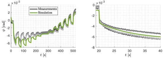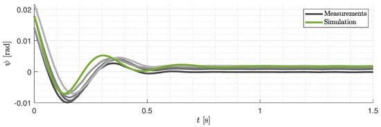 Measured and simulated yaw angle of the free response of the axle bridge. Three measurements in different shades of grey are depicted in the same style as in Figure 4.