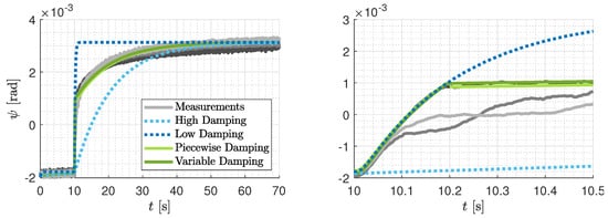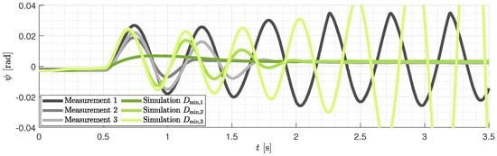 These considerations together with the previous identification of the damping suggest that the choice of is close to the optimum while also offering enough margin to the instability boundary. The yaw angle of the closed-loop system for this control can be seen in Figure 13, where a step of mm is followed. The three different measurements for the same setup can be seen in the three different shades of grey while three measurements for are displayed. It can be observed that the three measurements behave very differently despite these measurements being from the same setup. Two of the measurements converge to a constant value with different dampings, while the first measurement indicates that the system is unstable. This behavior shows that there is also a dynamic in the system that is not modeled in the proposed system. However, it can be seen that adjusting the damping value leads to an unstable response as well. Notably, this damping value is around 100 times smaller than the one identified in Section 4.3.3 due to the high frequent input. Combined with the fact that the closed loop with the proposed control law does not admit a consistent system behavior, this renders a simple P controller insufficient for the real test rig. Thus, a different control is proposed that generates consistent system behavior.