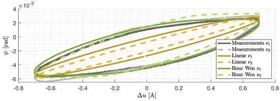 It remains to model the hysteresis, which plays a significant role particularly in the steady state values as can be seen in Section 3. Hysteresis is widely understood as a nonlinear phenomenon due to which a dynamic system does not provide the same input–ouput relation for low-frequency inputs when loading or unloading []. Or, in different words, for a linear system in the form of (6) with and a sinusoidal input , the plot of over is an ellipse which semi-minor axis vanishes for decreasing and converges to a simple line described by for . However, if the semi-minor axis of the ellipse does not vanish and is independent of the frequency, this is referred to as a ”rated-independent hysteresis” []. This behavior is illustrated in Figure 9, where the linear system is simulated for the higher damping obtained in the previous section and the input with , where mHz, and even lower frequency mHz. It can be observed that the minor axis of the dark orange ellipse, representing the higher frequency , decreases in size compared to the lighter orange ellipse, which represents the smaller frequency . In contrast, the results of the measurements displayed in light and dark grey show only minor changes between the two different frequencies. In order to capture this behavior, a hysteresis term is introduced. This can be achieved in different ways as there exist multiple approaches to model hysteresis, e.g., the Preisach model [], the Duhem model [], or the Prandtl–Ishlinskii model [] to name but a few. In this work, we decided to use the Bouc Wen model [] due to its compactness and manageable number of variables. This model defines the term