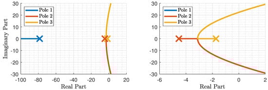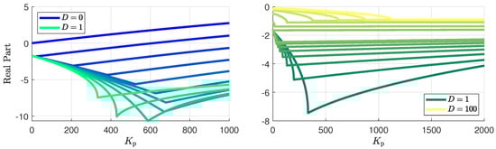 As discussed in Section 4.1, the rear wheel carrier lateral dynamics are stable. Combined with the yaw dynamics of system (10), this also leads to an open-loop stable system. Therefore, the control of the rear wheel carrier mainly robustifies the system and improves its dynamics. Keeping in mind that is large for a 1:1 prototype, it should be noted that system (10) contains a pole at 0 for . This makes a control indispensable to obtain a stable system. In this case, due to the form of the system, however, a P-controller is sufficient to stabilize the system. Thus, such a P-control is investigated in this system to establish a baseline performance and also validate the model proposed in the previous sections on the closed-loop system. Figure 11 shows the root locus of system (10) for output y and input . The crosses indicate the three poles for the open-loop system. It can be seen that due to the yaw dynamics being overdamped, one of the poles is very far in the left half plane while the other two have a real part of and . The latter two eigenvalues bifurcate into a complex pole pair for rising and reach the right half plane for , indicating that the choice of must be taken with care as it might lead to an unstable system. Naturally, this stability boundary depends on the damping of the yaw dynamics, and as discussed in Section 4.3.3, this damping varies dependent on the input and is not easy to model. With this in mind, the evolution of the poles with the highest real value is shown in Figure 12 for different damping D. It can be observed that an optimal gain exists for every D, which leads to the lowest possible real part. If the gain is higher than the optimal value, the real part rises until the system becomes unstable, while for smaller values, the real part is smaller, and therefore not the best possible performance is reached. For high damping, a similar behavior can be observed. For very high damping, the optimal value is also very high, and the stability boundary is also consequently much higher.