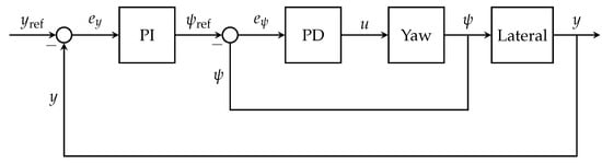 Due to the staircase form of system (10) and the points mentioned beforehand, the design of a cascaded control is proposed. Its structure is illustrated in Figure 14 with an inner PD control defined for a reference yaw angle ,