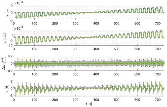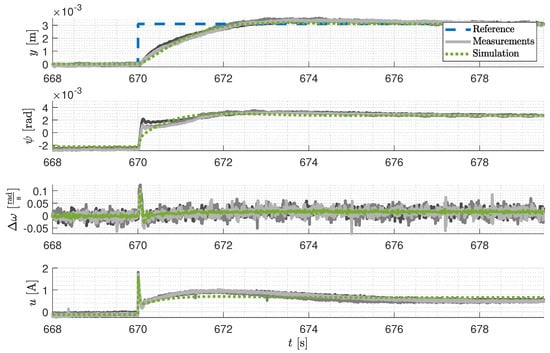 In this section, the performance of the proposed controller with the gains developed in Section 5.2.3 is investigated by applying the control for lateral reference signal similar to the one in Section 3. The reference signal consists of a sequence of steps from 0 to where . This reference signal showcases the stationary convergence of the closed-loop system despite the significant influence of the hysteresis while also showcasing the dynamics properties. Additionally, the simulation with the model developed in Section 4.1, Section 4.2 and Section 4.3 and the parameters from Table 1 are discussed. The lateral displacement, yaw angle, differential angular velocity, and input can be seen in Figure 15 and Figure 16. Both plots show three different measurements of the same scenario in different shades of grey, and the simulations results aremin green. First, we point out that the three measurements align very closely, showing that the closed loop under this control yields very consistent results, especially when compared to the measurements in Section 5.1 where even the stability properties vary. For the simulation results, it can be seen that the simulated lateral displacement, yaw angle, angular velocity, and input align very well with the real measured lateral displacements. For the performance of the control, it can be seen that input u is well within the saturation limits of 4 A given in Table 2. Additionally, the reference is followed closely with a rising time of around 2.7 s, a small overshoot of , and a settling time of around 7.3 s. All in all, the proposed control offers satisfying and consistent results, fast transitional behavior, and negligible steady–state error.